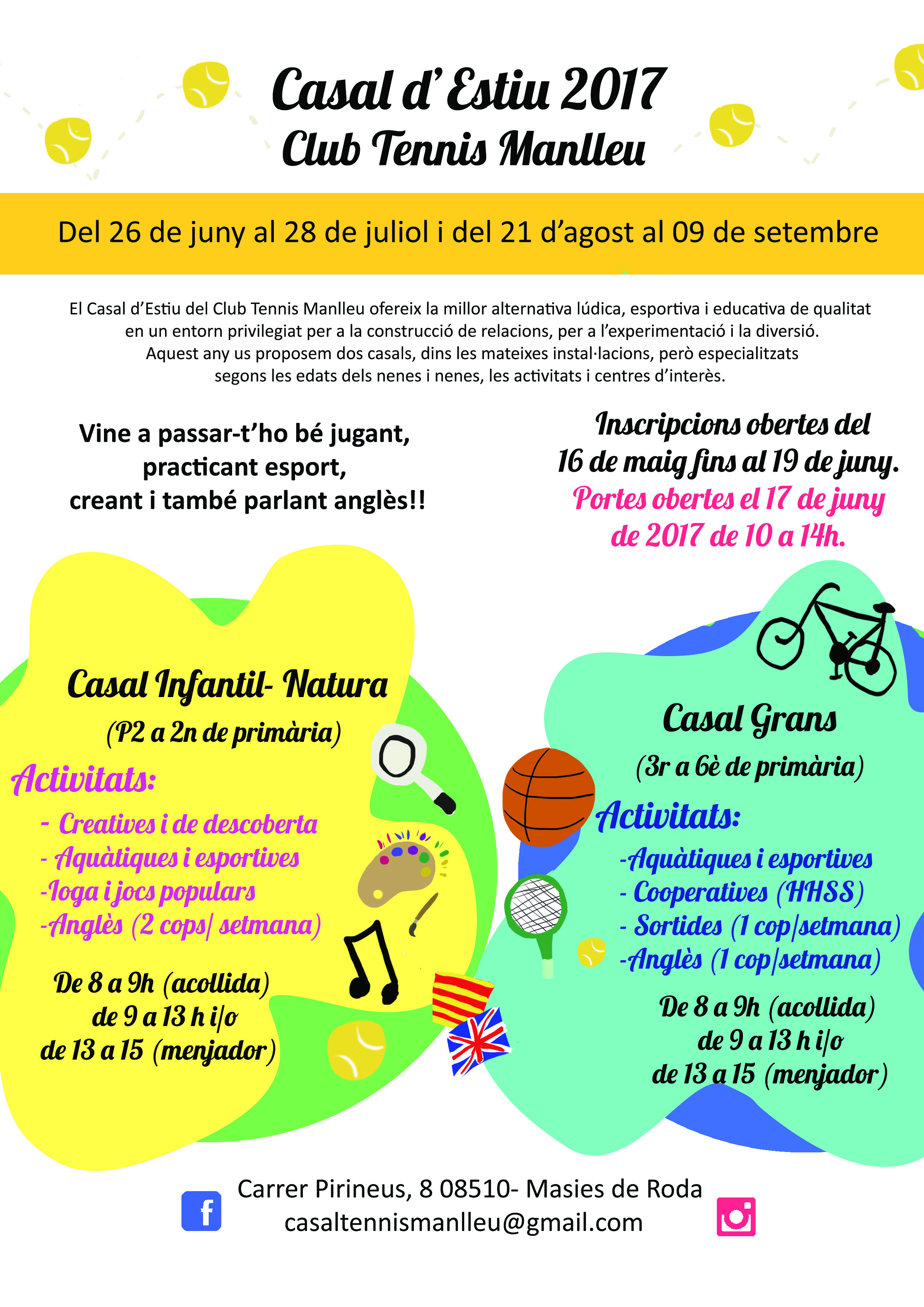 L’estiu ja s’acosta i per això ja tenim organitzat el CASAL D’ESTIU d’aquest any perquè, un any més, sigui fantàstic! Teniu disponible tota la informació a la nostra pàgina web o clicant al següent enllaç: https://www.clubtennismanlleu.cat/casal-infantil/