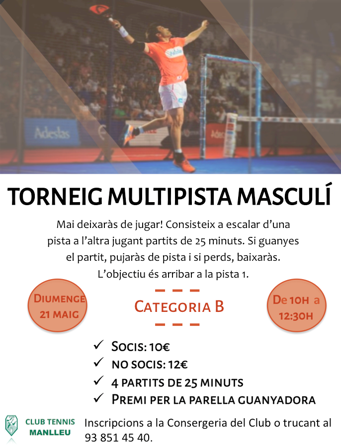 El proper diumenge 21 de maig a les 10h del matí es disputarà al Club Tennis Manlleu el Torneig Multipista Masculí. Va adreçat a socis i a no socis de categoria B i el preu és de 10€ pels socis i de 12€ pels no socis. Es disputaran quatre partits de 25 minuts cada un.