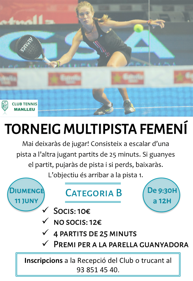 El proper diumenge 11 de juny a les 9,30h del matí es disputarà al Club Tennis Manlleu el Torneig Multipista Femení. Va adreçat a socis i a no socis de categoria B i el preu és de 10€ pels socis i de 12€ pels no socis. Es disputaran quatre partits de 25 minuts cada un.