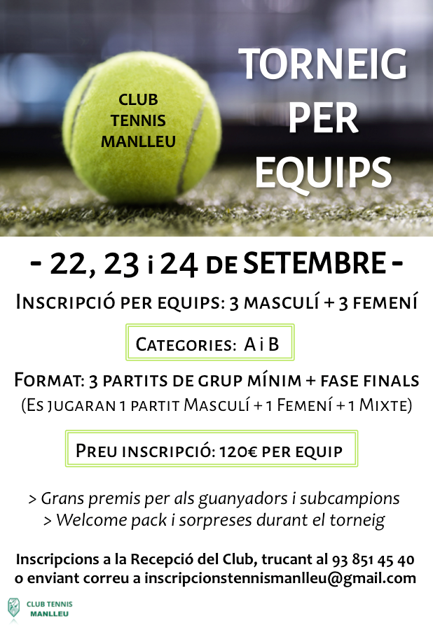 El 22, 23 i 24 de setembre farem el Torneig de pàdel per Equips! És obert a tothom i els equips han de ser de sis persones (3 masculí + 3 femení).