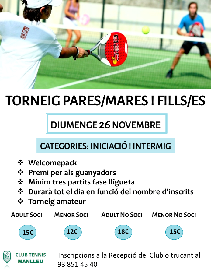 Vols jugar un torneig de pàdel amb el teu fill/a? Doncs el diumenge 26 de novembre tens l’oportunitat de fer-ho amb el torneig de pàdel de pares/mares i fills/es que farem al Club.
