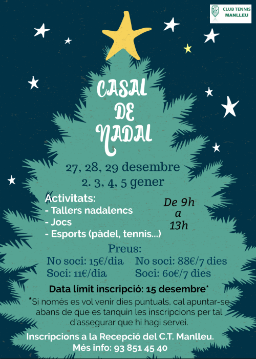 Per primera vegada, aquest any el Club Tennis Manlleu ofereix un Casal de Nadal adreçat a tots els nens i nenes que vulguin venir als matins a divertir-se i a passar una bona estona.