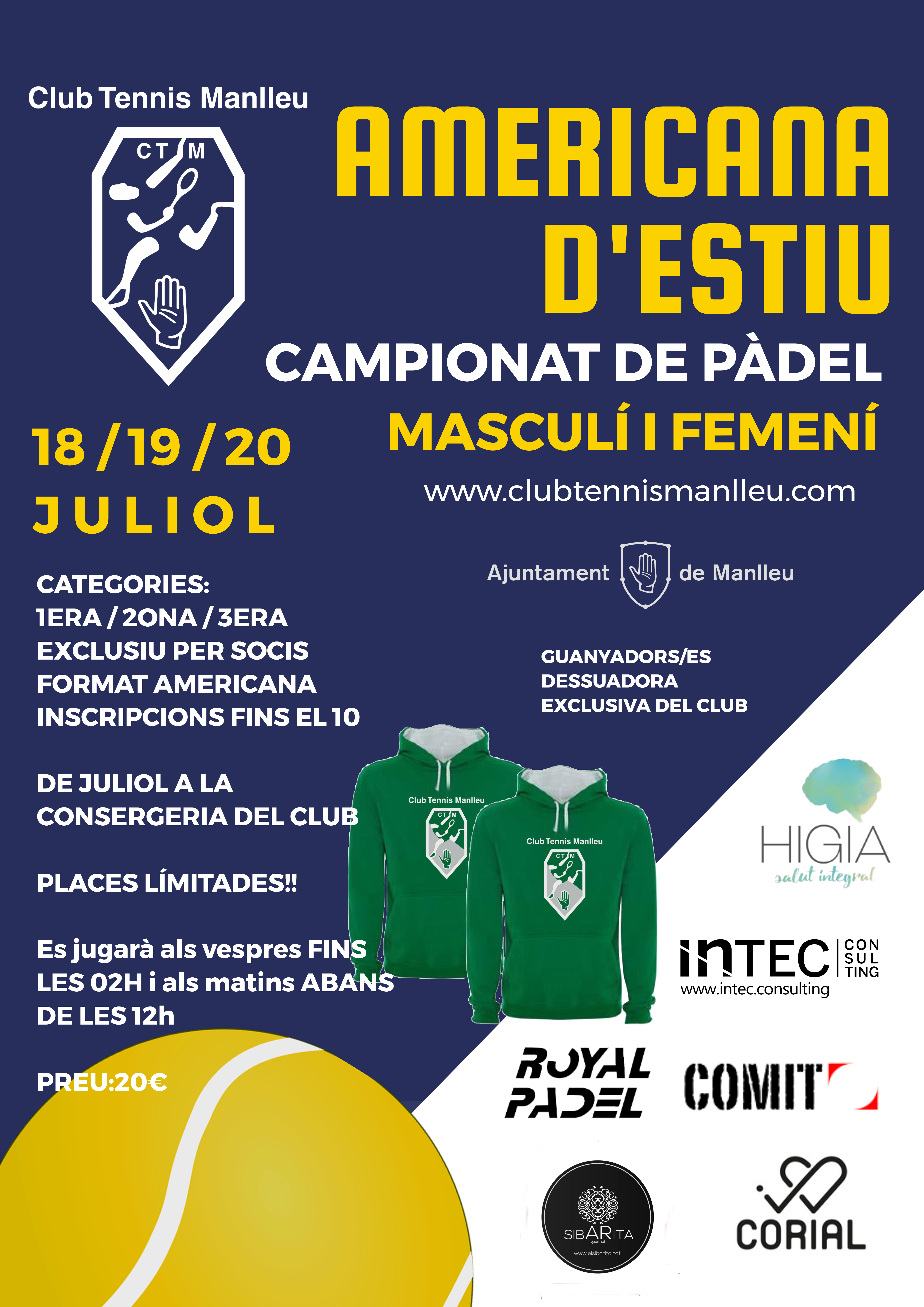 Els dies 18, 19 i 20 de juliol es jugarà al Club l’Americana d’Estiu, un campionat de pàdel Masculí i Femení exclusiu per als socis del Club.