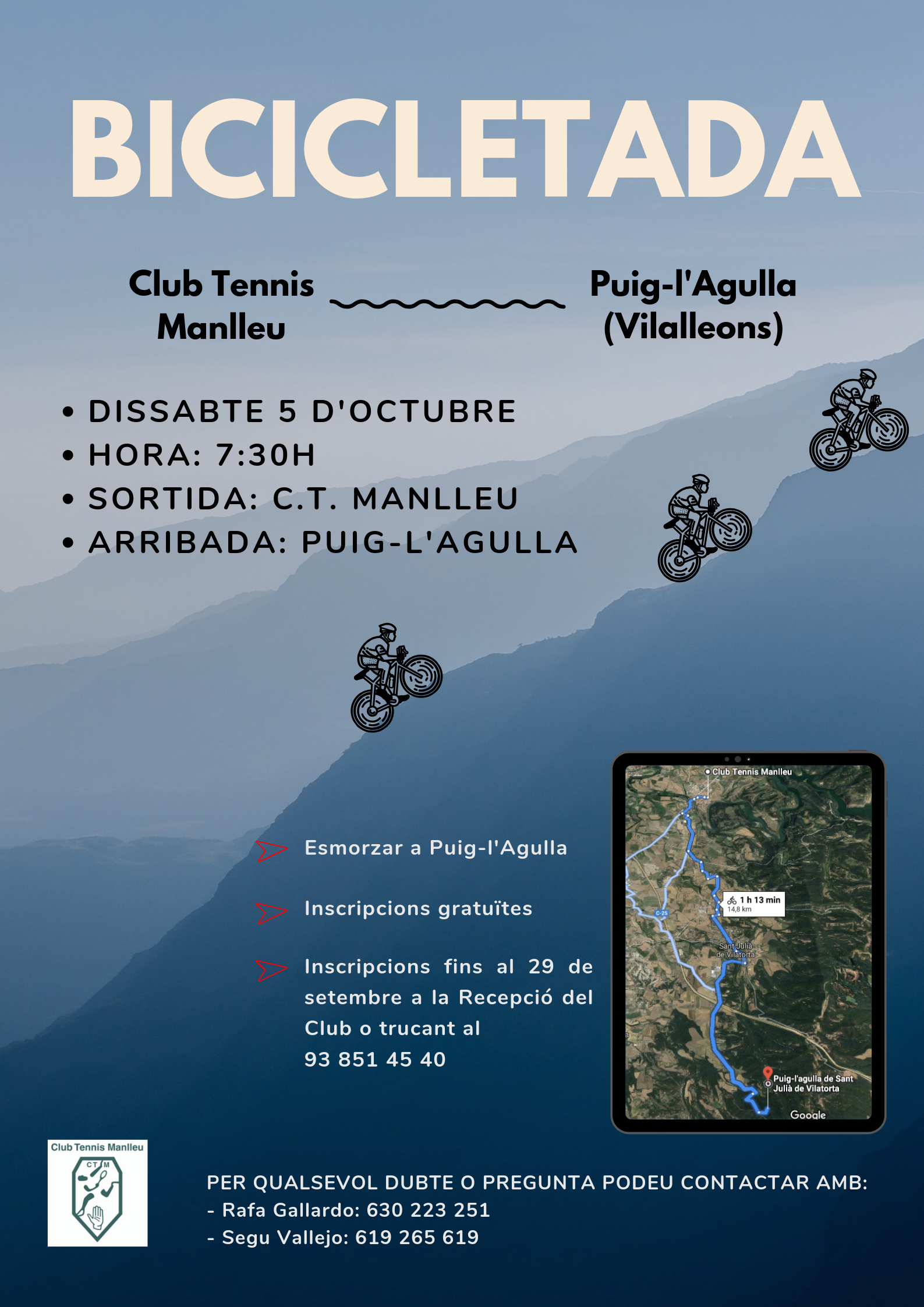 El dissabte 5 d’octubre farem una bicicletada on es pot apuntar tothom qui vulgui. Sortirem des del Club a les 7:30h i anirem fins a Puig-l’Agulla (Vilalleons). Un cop arribem es farà un esmorzar.