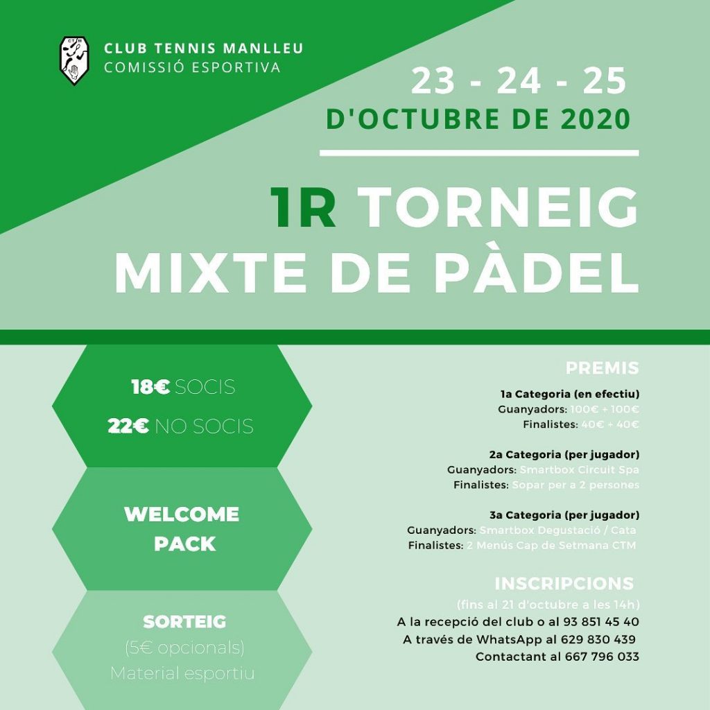 Els dies 23, 24 i 25 d’octubre es disputarà al Club el primer Torneig Mixte de Pàdel. El format serà d’una fase de grups i una segona fase d’eliminatòria. El torneig és obert a tothom, socis i no socis.